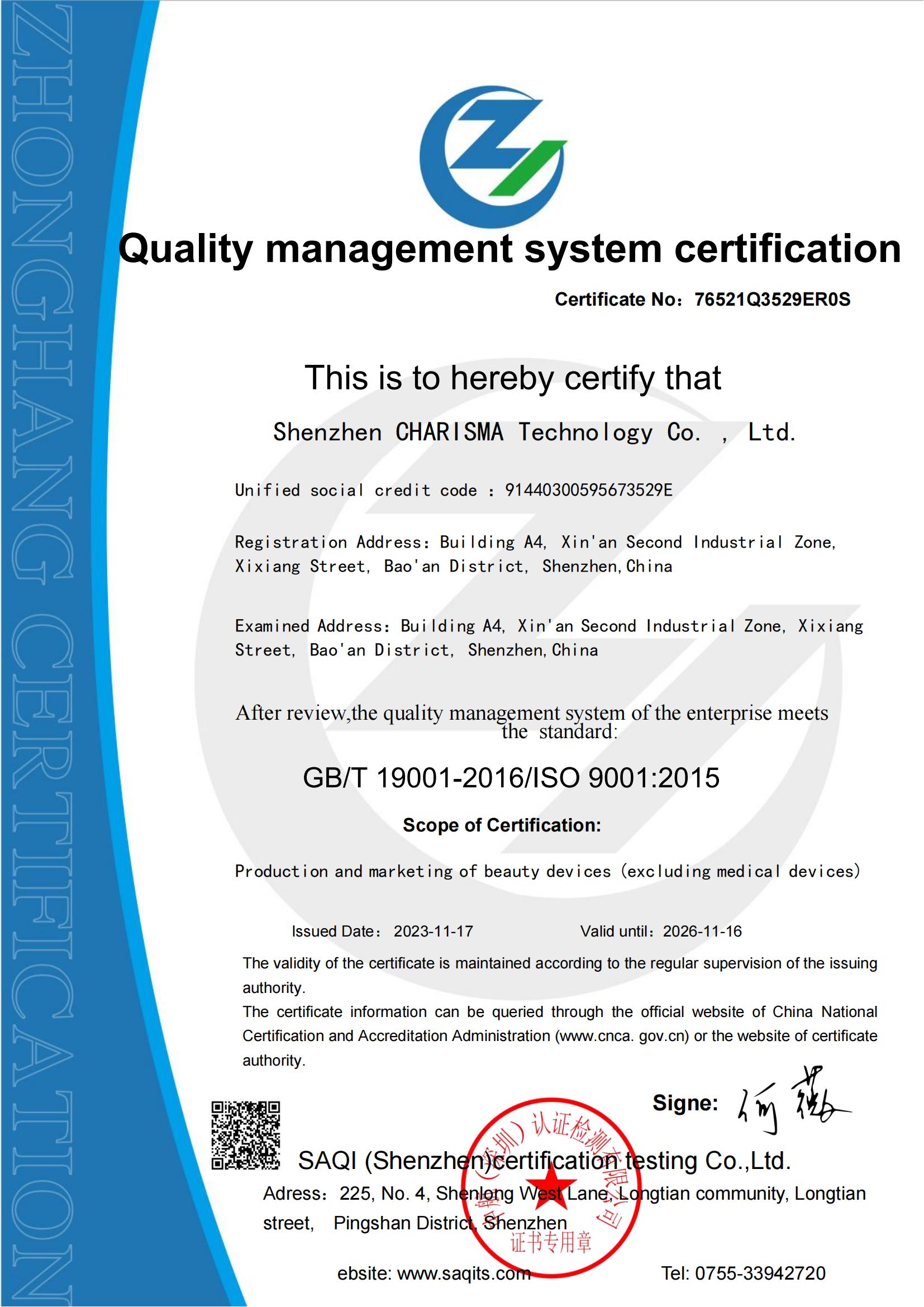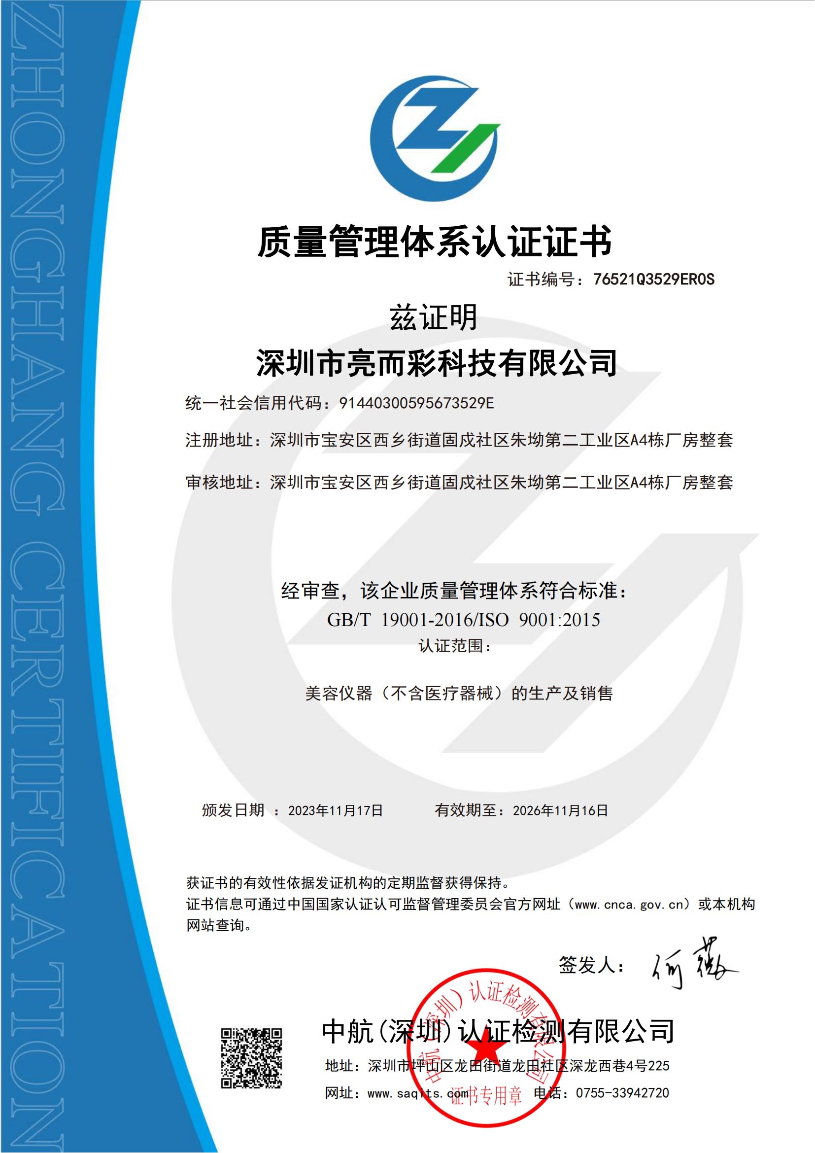 深圳市亮而彩科技有限公司-QMS證書